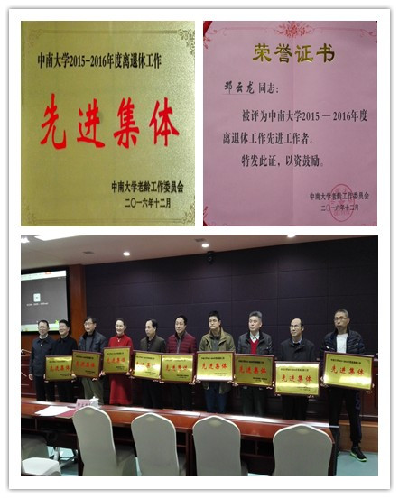 我院离退休工作在院党委和行政的正确领导下,认真贯彻落实老同志的政治待遇、生活待遇,让每位离退休的老同志能真正地享受”六有”的同时又乐于奉献。她们积极走访慰问困难、生病、空巢老同志,倾听老同志的心声,想老同志所想,把工作做到细处、落实到实处,稳扎稳打替老同志们分忧解难,得到了离退休党委、离退休处的高度赞扬。本次表彰会由离退休办主任彭艳代表我院战斗在离退休工作岗位上的全体同志接受2015-2016年度中南大学离退休工作“先进集体”授奖,党委副书记邓云龙获得了离退休工作“先进个人”的光荣称号。