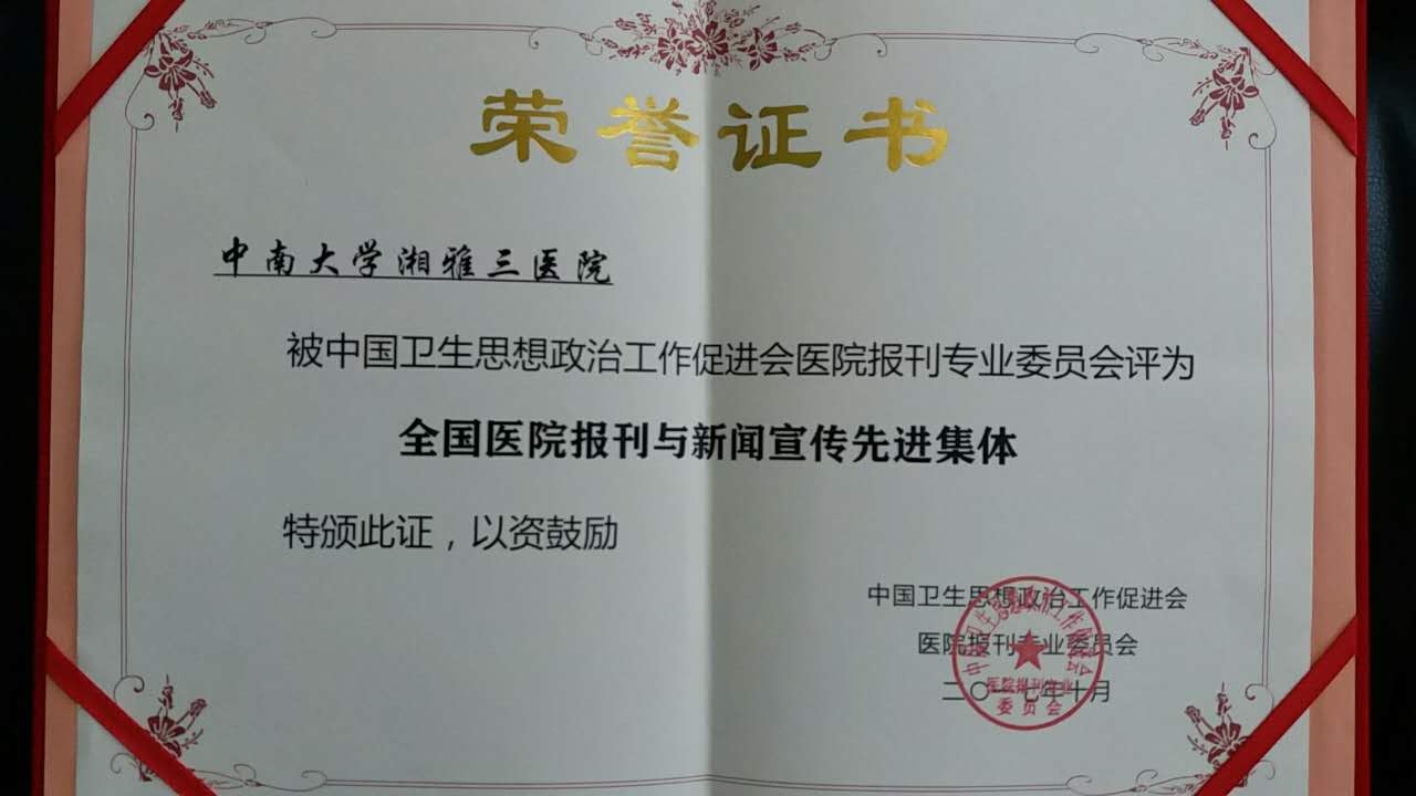 会议期间,对2016年度宣传工作先进集体、先进个人及优秀论文进行了表彰。中南大学湘雅三医院荣获全国医院报刊与新闻宣传先进集体,论文《党建引领最年轻国家队跨越发展》荣获优秀论文。