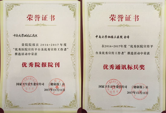 11月30日-12月2日,由国家卫生计生委宣传司主办的“优秀医院宣传平台及优秀宣传工作者表彰交流会”暨新闻宣传培训班在郑州举行。中南大学湘雅三医院荣获“优秀院报院刊奖”,党委宣传办副主任余希荣获“优秀通讯标兵奖”。国家卫生计生委宣传司调研员解瑞谦、《健康报》副总编辑闫丽新等出席会议。