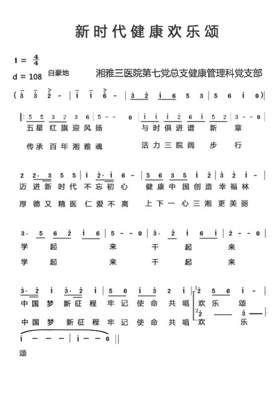 《新时代健康欢乐颂》的歌词中融合了湘雅三医院的文化精神。健康管理科作为医院重点打造的品牌科室,是湖南唯一一家全国首批“健康管理示范基地旗舰单位”,为三湘大地乃至于全国人民提供贴心可靠的健康管理服务,在受检者中有口皆碑。在十九大开启的健康新时代中,健康管理科全员将“学起来”、“干起来”,昂首走上发展新征程,拥抱健康管理中国梦。
