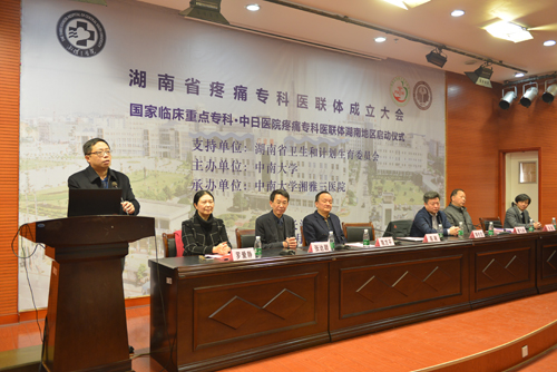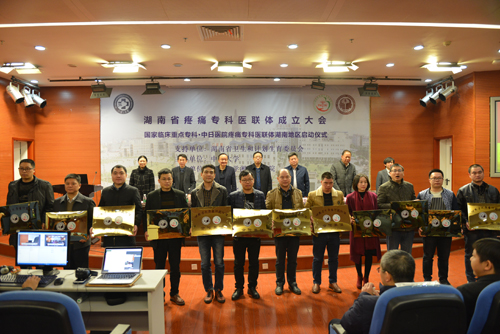 湖南省卫计委医政医管处副处长李世忠,中国疼痛学会候任主任委员张达颖,中日医院疼痛科副主任朱谦副教授,湘雅三医院党委书记罗爱静、院长陈方平、黄飞舟等领导与专家出席,并为协作单位和合作单位授牌。