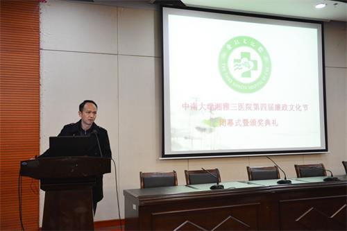 12月28日晚7点,中南大学湘雅三医院第四届廉政文化节闭幕式暨颁奖典礼在外科楼二楼多功能学术报告厅举行,闭幕式由医院党委副书记邓云龙主持,医院院领导、各党总支书记、行政后勤中层干部、党总支纪检委员、纪检监察专干、获奖代表、离退休同志参加了本次活动。本次活动还特邀中南大学纪委副书记唐忠阳作执纪审查工作专题讲座。
