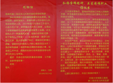 当即,张丽安护士长对她给予了安慰及心理疏导,积极与心内科专家咨询治疗方案,并向第二党总支书记苏莉进行汇报。苏莉书记高度重视,在支部副书记陈志衡老师的带领下,在儿科第二党支部发起了“为困难职工献爱心”的活动。在儿科领导的关怀及所有同事的帮助下,刘某小孩已于3月14日顺利完成“室缺封堵术”,重燃生命的希望。