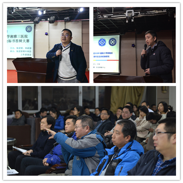 本次活动由湘雅三医院团委、科研部联合主办,青科协承办,团委工作部学习部协办,比赛得到院党委副书记、纪委书记张劲强及党委委员、副院长朱晒红的关心与指导,邀请到教育部新世纪优秀人才、基础医学院副院长熊炜教授,青年解剖学家、基础医学院副院长黄河教授,教育部新世纪优秀人才、湘雅三医院青科协主席、医学实验中心常务副主任邓昊教授,国家优秀青年基金获得者、湘雅医院谢辉教授,青年学者、湘雅二医院科研部副部长颜苗副教授担任评委。在科研部的指导下,工作人员经过仔细筛选,在医院近年来数百份国自标书中挑选出9份优秀标书进入决赛。大赛由湘雅三医院青科协执行主席彭程设计构思,科研部主任曹科主持比赛并进行了国自申报动员讲评,院团委副书记程海威预告了青科协换届调整事宜。医务部主任张翼、护理部主任严谨、门诊部主任阎雪彬、营养科副主任刘敏、康复科副主任李旭红、护理部副主任钟竹青、药剂科副主任彭向东、妇产科教研室副主任肖松舒、健康管理中心副主任曹霞、评价部副主任唐永忠、宣传部副主任蒋凯等到场观摩指导。