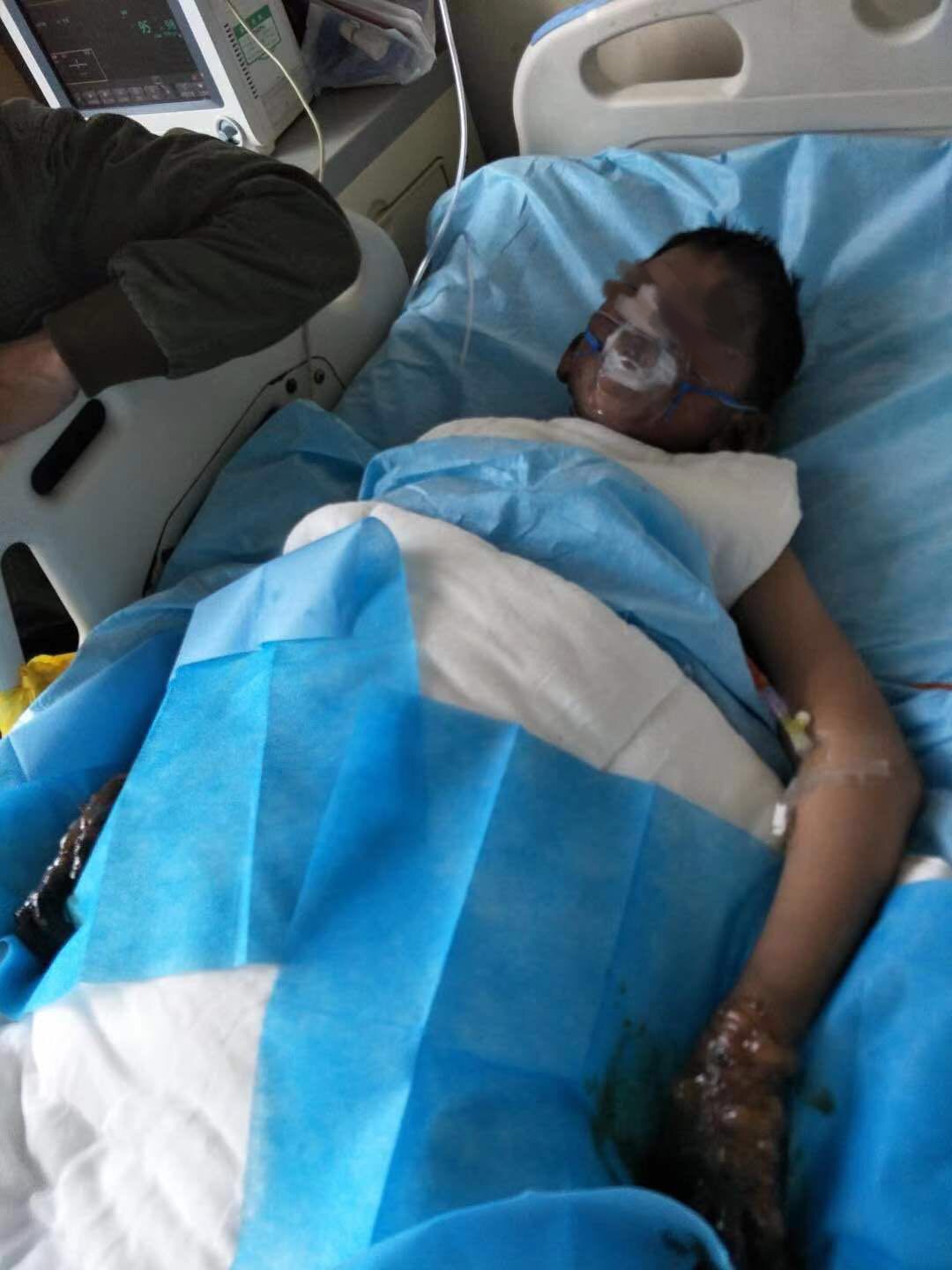2月13日7点45分,辗转多家医院的桃江患儿钟某被救护车送往中南大学湘雅三医院烧伤科,诊断为全身多处烧伤合并重度吸入性损伤,伴有呼吸困难,呼吸道分泌大量黑色碳末颗粒。彭浩副教授查房后当机立断于9点30分急诊行气管切开术,目前患儿生命体征基本平稳。