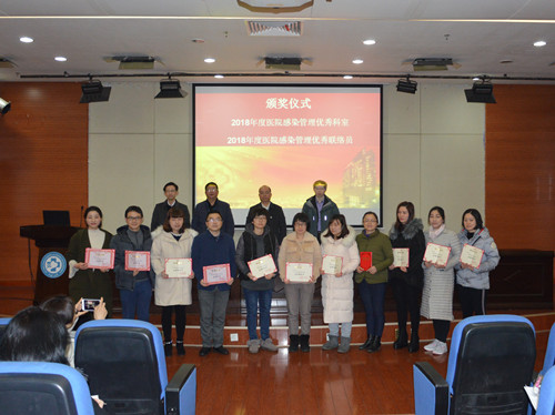 会议上表彰了2018年度医院感染管理优秀科室:耳鼻咽喉头颈科、内科重症监护室、器官移植科、肿瘤科;2018年度医院感染管理优秀联络员:唐淇、王倩、姚丽萍、龚昕、杨青兰、陈捷、秦小华、曾宾芳等8人。院领导杨飞龙、张劲强、欧阳文为获奖的优秀代表颁奖。