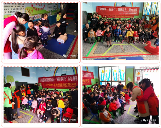 在团山湖村中心幼儿园,一堂针对小朋友的趣味急救科普课在此生动上演。幼儿园教职工、村委会工作人员及七十余名儿童参加了培训。授课教师从案例入手,对120联络、紧急心肺复苏、气道异物梗阻急救、溺水急救、小儿抽搐急救、止血包扎等急救知识和技巧进行了深入浅出地讲解,并现场情境模拟演示了心肺复苏和异物梗阻施救法——“海姆立克急救法”的操作规范流程,随后学员们在培训老师的指导下进行了操作训练。