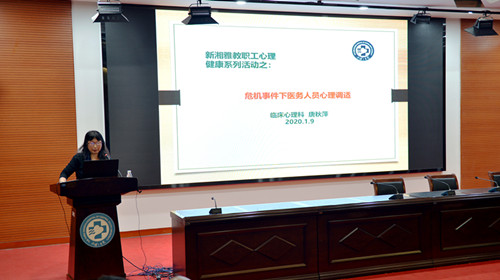 针对医务人员心理应激反应,医院临床心理科教授唐秋萍为大家讲授了“危机事件下医务人员心理调适”。她重点介绍了危机事件下医务人员容易产生的几种心理不适情形,从专业角度讲解了加强危机预防及开展心理干预的知识和方法,以及如何有效识别诊疗过程中存在的潜在风险。