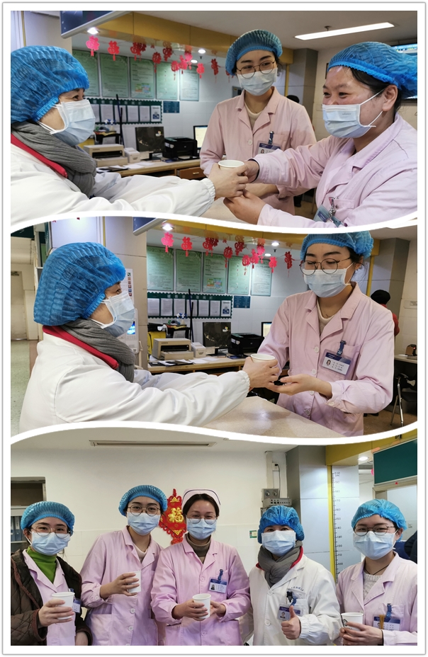 1月27日(大年初三),中医科主任肖岚、护士长李碧艳给奋战在临床一线的呼吸内科医护人员送去了热腾腾的预防新冠状病毒肺炎的中药茶,感恩他们的坚守和付出,叮嘱他们在高强度的工作状态下加强自身防护,防范感染。