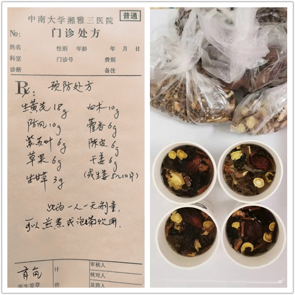 为了应对新冠状病毒肺炎疫情,湘雅三医院第二党总支中医科积极行动。参考国家卫健委、国家中医药管理局中医高级专家组针对这次新型冠状病毒疫情的中医预防及诊疗方案,中医科肖岚主任提供了预防新型冠状病毒感染的中药处方:生黄芪15g、白术10g、防风10g、紫苏叶6g、藿香叶6g、陈皮6g,草果6g、干姜6g、生甘草3g。煎汤分两次服,每日1剂;亦可用开水泡服代茶频饮,每日1剂。该中药处方具有益气固表,健脾和胃,芳香避秽,祛寒除湿之功,能够增强人体正气,提高机体抵抗外界疫气的能力,有助于预防新冠状病毒感染。