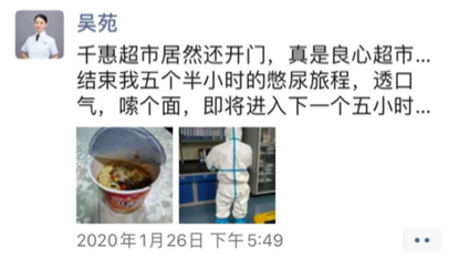 笔者1月27日大年初三在门急诊实验室见到吴苑老师,发现她的眼睛已经被各种护具勒得又红又肿、眼泪汪汪,方才注意到各个值班的同事额头和脸颊上深深的勒痕都是几小时难以消退,心里满是止不住的心疼。趁着午休吃饭时间来看看临床分子诊断实验室的老师们都只能隔着厚厚的隔离门给他们加油打气,也碰巧见到了在静静穿戴防护服的李红卫老师。