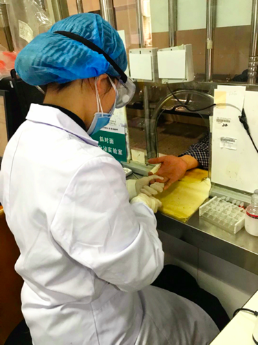 1月27日大年初三,廖金凤、屈琳老师在采血窗口耐心地接待每一位病人,某些病人递进来的手是冰冰凉凉的,这样末梢血液循环不好会影响采血,他们都一一为病人按摩捂热,确保采血的每一个环节。检验科工作人员将操作的细节发挥到底,方显现对病人真正的关心。