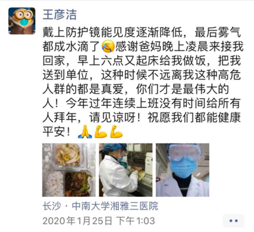 相信这个时刻,坚守岗位的医护人员最担心的不是自己而是因为自己身为高危人群会累及家人。唐衡彬老师在初一晚班接触过疑似病人标本后,在科里待了一夜一天直等到该病人新型冠状病毒核酸检测的阴性结果才敢回家。与同事们交流经验得知,值班结束的同事们都是在进家门前脱掉外衣裤鞋子并且洗澡后才敢和家人接触。