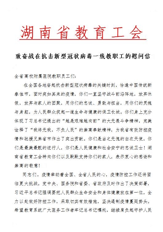 1月28日, 湖南省教育工会发出《致奋战在抗击新型冠状病毒一线教职工的慰问信》,向全省高校附属医院教职员工们表示衷心的感谢和崇高的敬意。
