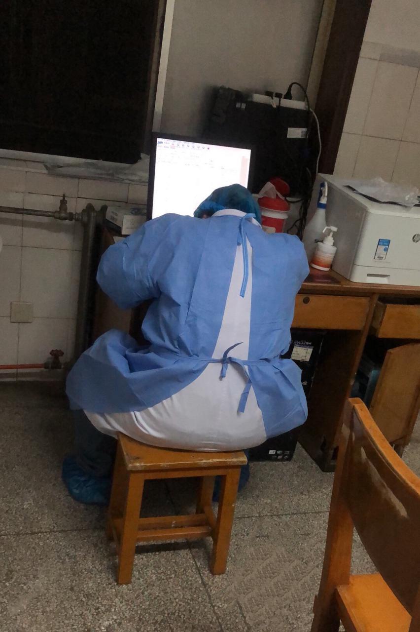 李艳医师是一位怀孕三个月的准妈妈,考虑到当前疫情严重,科室工作量大,人员紧缺,她仍坚持与同事们一起坚守岗位。科室防护物资有限,为了节约装备,她尽量少喝水、少上厕所,晚班时累了就趁着没有病人来检查的时段里,趴在桌子上小憩一会。