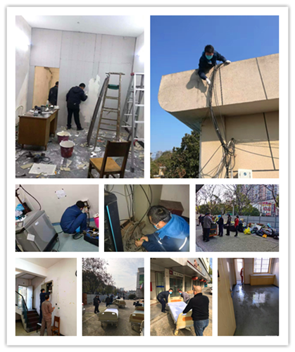 接到校友楼改造为发热诊区任务后,由于过年期间各类施工维修人员调配困难,后勤保障部发起倡议书,号召各班组党员冲锋在前,带领全体员工积极响应,从初二开始,在维修、搬运各类人员及物资极度紧缺的情况下,由后勤保障部各班组人员进行维修改造、房屋布置、物资运送、区域清洁真理、家具病床搬运、在三天的时间里完成了新发热诊区楼栋的改造启用。