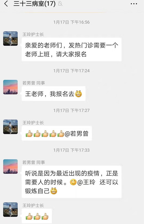 1月17日下午5点多,才上完一个大夜班的我,刚从睡梦中醒来,手机里关于新型冠状病毒的疫情新闻,让我突然清醒过来,一看微信消息,科室群里护士长王玲在问过年期间是否有人报名去支援医院发热门诊,来不及多想,我赶紧在群里报了名,因为我是科室唯一没有结婚、没有小孩的护士,我相信我有足够的精力和充沛的体力,我也深深感受到作为一名医务工作者的使命感与责任感。