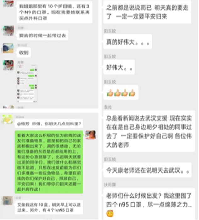 出征的前夜,重症医学科办公室里彻夜灯火长明,在杨明施的统筹下,护士长何志萍带领同事们为出征队友筹备物资,忙到深夜。防护物资极度紧缺的情况下,重症科把科室仅有的N95口罩全部分配到了本次出征的队友的手上,携带的物资中,大到防护用品、药品,小到纸尿裤、创口贴、暖宝宝、老干妈等等,一应俱全。为一线的战友们多一份安全,有同事把自己家里最后的一点防护物资拿了出来配发给出征的同志;有同事自发地跑遍长沙各个超市药房,就是为了给出征的同志筹集一点备用的外科口罩和药物。董文静老师下了晚班后,拖着一身的疲惫还一直为大家准备医疗物资,一直忙到凌晨3点多。防护物资送来了,防寒用的电热毯送来了,家乡的辣椒送来了,贴身穿的衣物送来了……一时间办公室里堆满了大家源源不断送来的物品,只为给战友们尽自己的一份绵薄之力。在物资紧缺的当下,科室最大限度地为大家筹集了物资,可杨明施和何志萍还是不放心,一方面叮嘱大家防护的注意事项,一方面鼓舞大家的士气。这就是我们朴实而又温暖的重症大家庭。