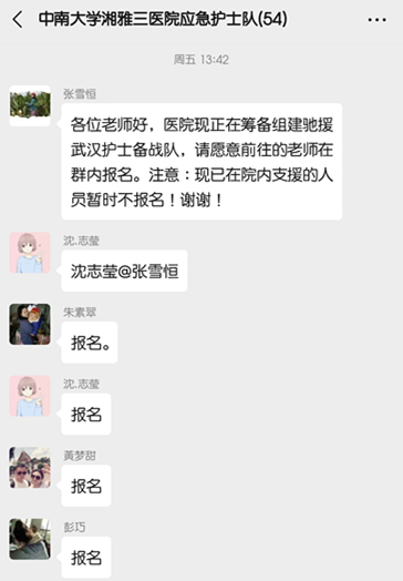 微信里是铺天盖地的信息。原本要上夜班,护士长立即改班告诉我取消夜班,整理所需物品,好好休息,为备战一线做充足准备,并叮嘱我一定要保护好自己。科室姐妹们已经开始给我紧罗密布地进行物资准备。直到凌晨科室群里还在你一言我一语的说着能提供什么,明天去帮我买什么,这一瞬间,我强烈的感受到了来自湘雅三医院这个大家庭的温暖。我反复告诉自己:我不是一个人在战斗,我也不是一个人去前线,我的身后有着一群爱我的和我爱的亲人和家人。那些来自科室老师、领导们的关怀,还有我那群亲爱的姐妹们,他们的帮助让我的武汉行信心倍增。当晚,我眼角挂着激动与感动的泪珠,安心的进入了梦乡……