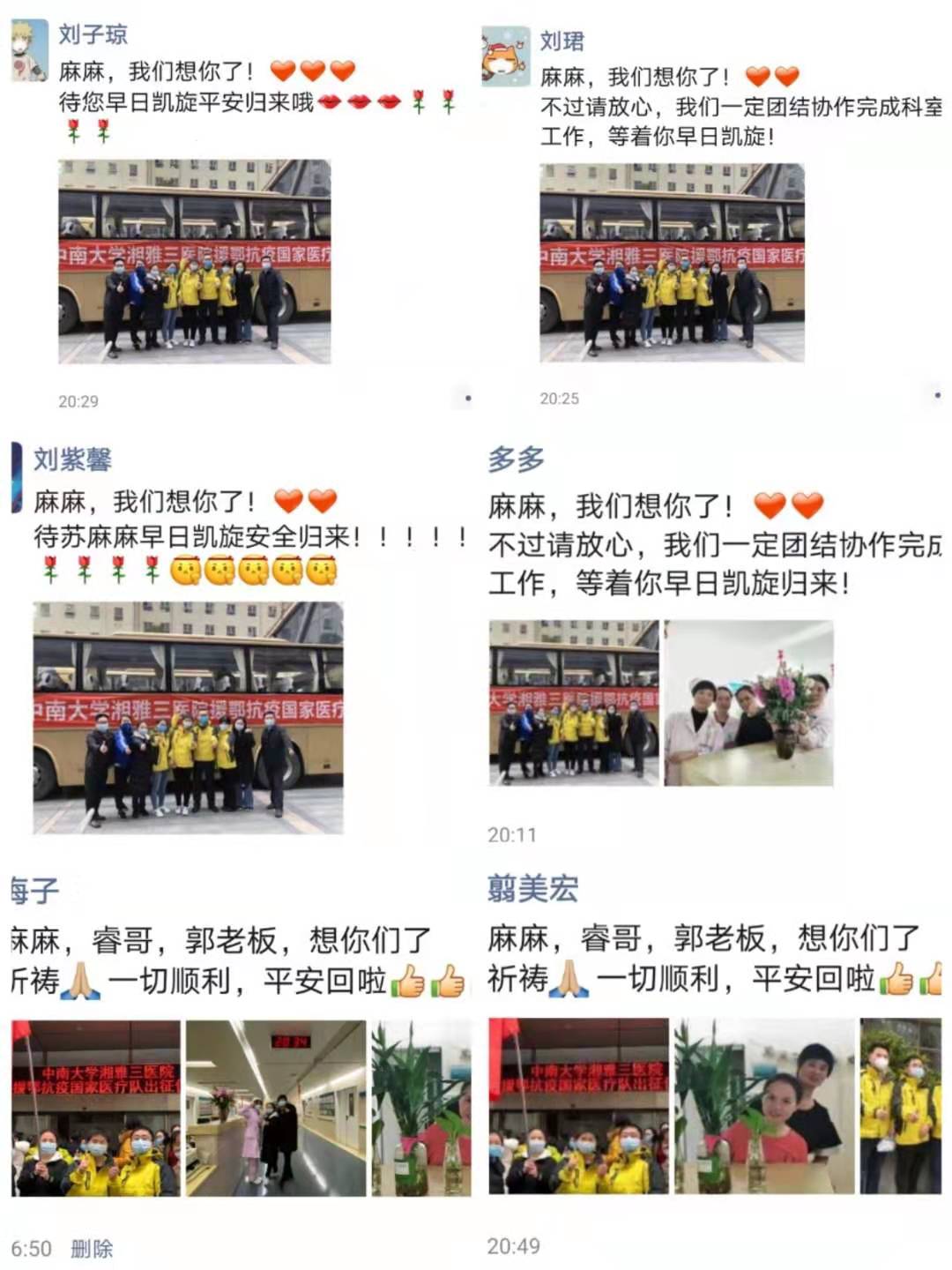 春节期间,因为新冠疫情,苏麻麻主动报名,支援发热门诊。2月7日,医院接到支援武汉的通知,她又是早早的报了名,名单出来的那一刻,心愿达成了,成为奔赴武汉的光荣一员,她比谁都清楚此行面临的巨大挑战与风险,但她义无反顾,还说这样做不愧对党的培养和自身的职业价值。2月8日是农历正月十五,国人特别看重的节日——元宵节,她一大早就来到医院,剪短发、培训、整理姐妹们前一晚上给她准备的行李。中午一点,她匆匆地扒了几口盒饭,准时出现在集合队伍中。中午两点,在跟我们的姐夫(省肿瘤医院古教授)短暂告别后,苏麻麻毅然决然地登上前往高铁站的大巴。