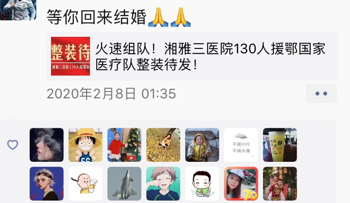 2月7日,得知有机会上前线的消息,作为一名医护人员,一名党员,我毫不犹豫就报名了。我第一时间把想法告诉了吴先生,吴先生起初皱着眉头沉默不语,他问了我一句“确定要去吗?”“确定!”“那我支持你!”于是,他立刻帮我列清单,准备带的物资,洗漱用品、零食、衣服……满满两大箱子,恨不得把整个家都搬过去,还开玩笑说:“能把我带过去吗?我去给你们做伙夫。”可见吴先生对自己的厨艺还是充满自信的。当天晚上,吴先生唠唠叨叨叮嘱了我一晚上,平时话少的他突然就变成了话匣子。虽然我们没能如期举行婚礼,但不知不觉你早已是我最亲的人。