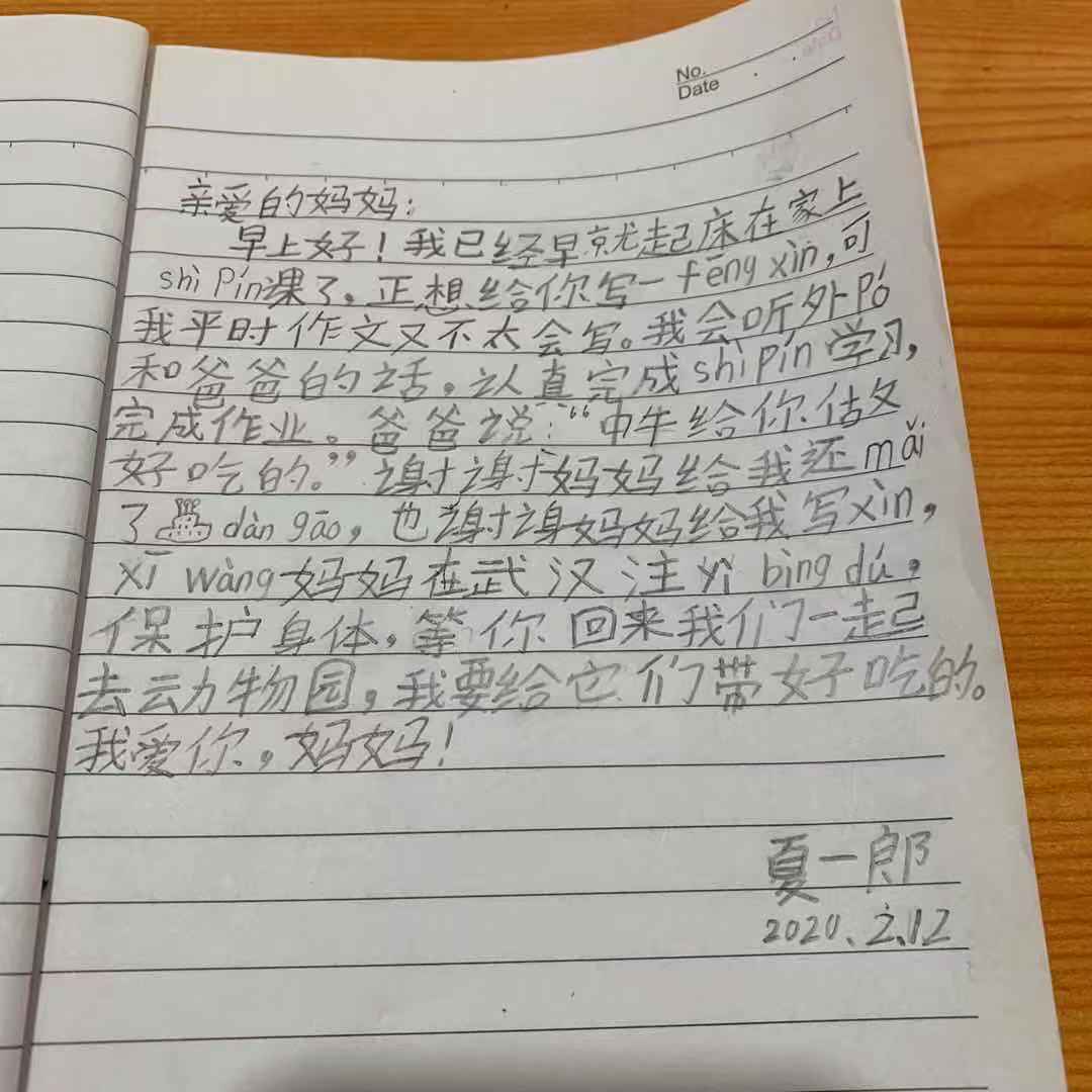 早上好,我已经早就起床在家上视频课了,正想给你写一封信,可我平时作文又不太会写我会听外婆和爸爸的话,认真完成视频学习,完成作业。爸爸说中午给我做好吃的,谢谢妈妈给我还买了蛋糕,也谢谢妈妈给我写信,希望妈妈在武汉注意病毒,保护身体,等你回来我们一起去动物园,我要给它们带好吃的。我爱你,妈妈!