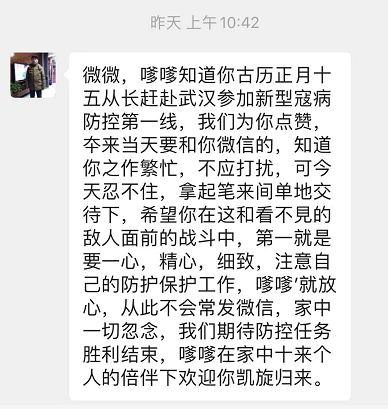 外公的信息我还在细细品味,表弟的关心又来啦。他自己唱了一首“我的姐姐”录制好给我听,明显听到了他声音中的那一份伤感与期望,泪水又一次止不住的流下。家人的担心,朋友的担心不停的涌向我,爸爸妈妈要求我至少每天都要跟他们视频一次,不论再晚他们也一直等着。儿保科的姐妹们在群里时刻问我好不好,安全不安全,要求我每天必须在群内报平安。这些事情已经成了我的任务!