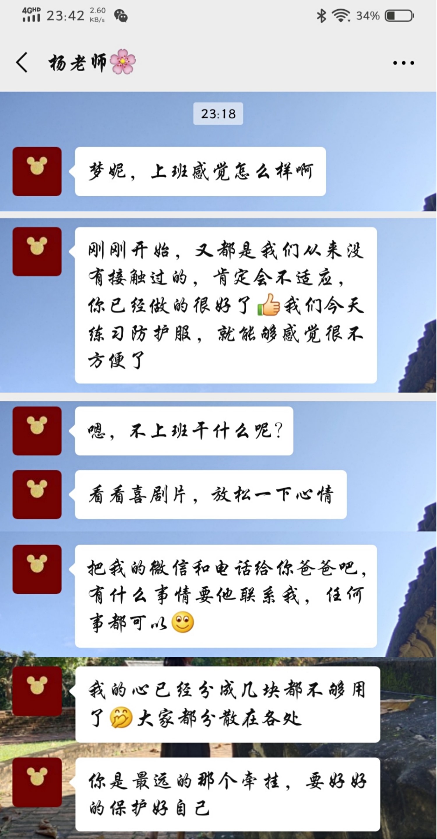 原来的你,雷厉风行,快人快语,但现在,你脱下了工作时“女强人”的外衣,把无尽的关心、爱护、思念全都给了我们。我知道现在科里姐妹们有的去了预检分诊,有的去了发热门诊,有的去了普外科支援……在您的带领下,我们义无反顾,勇往直前!正如您所说:“现在一颗心分成几块都不够用了。”而我是你最远的那个牵挂。为了让您放心,出发前我就答应每天给您报平安,然而,每次还没等我发信息给您,您的爱心短信就已经显示在我的手机屏了。不论我们每天聊多聊少,您总是不会忘记提醒我注意防护,保护好自己,反复的提醒总会让人记忆深刻,我明白您的良苦用心。