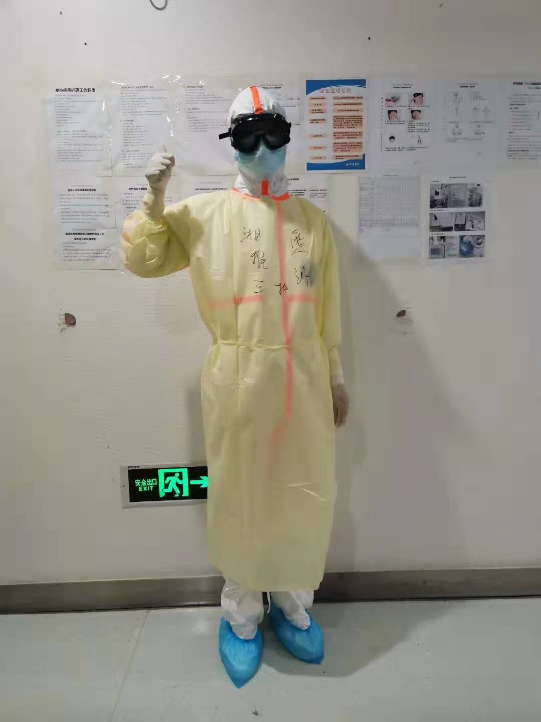 到达医院,护士长一个一个协助我们穿隔离衣、防护服,一个一个环节地检查,生怕漏掉一个细节,到最后要进入病房的那一刻,还再次确定你带了几双手套?衣服完整吗?眼睛有雾气吗?然后对我们说:“好的,加油!”我们科同行的的妮子还不忘在我进门那一刻给我衣服前后画个小爱心,真的给我满满信心。