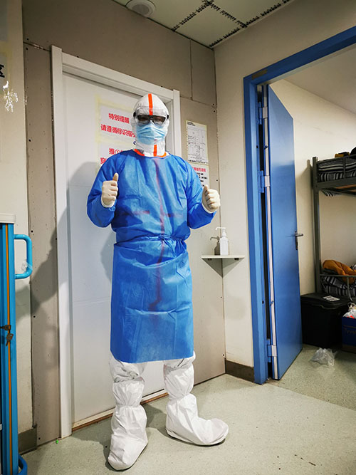 夜已深,频繁走动一方面容易接触病毒,另一方面这身装备呼吸也难受,再者倒夜班也确实辛苦,自己毕竟不是年轻小伙子了,于是在工作站坐了一小会儿。与我一起工作的我院护理人员进来了四名,其中有三名是男性,从晚上三点熬到九点,也累得神劳行瘁。还算平安,没有什么危重患者需要抢救了。接班的同事来了,于是我们这批准备一同出去,顺便检查各自脱隔离装备的动作。