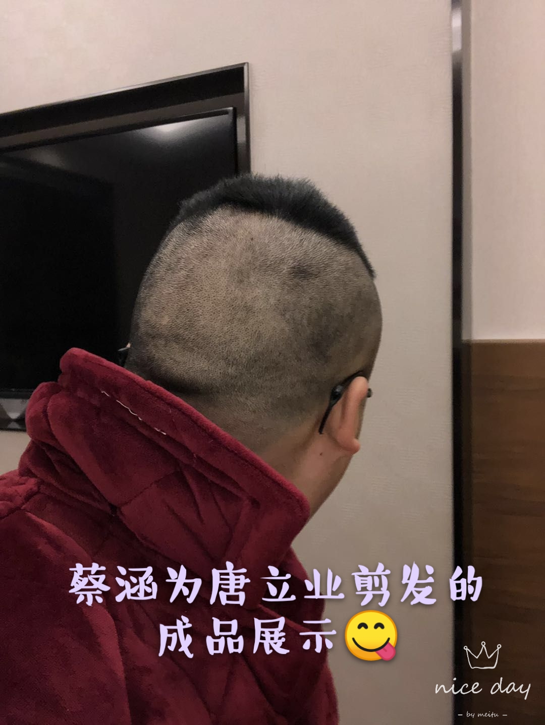 可没想到今天的话题居然从“两个小男孩‘聚众’理发”说开来。说是“聚众”,其实只有他俩自给自足,而且防护措施绝不能少。难得唐立业和蔡涵休息,为了更好地防疫到位,立业决定牺牲自己的发型让蔡老师练手。蔡老师也毫不手软,利用自带工具启动理发模式,可惜理到一半沒电了,只能设法收尾。不过这发理得还挺有型,不信大家瞧瞧!蔡老师也很有成就感,并自詡:今天接了许多单!