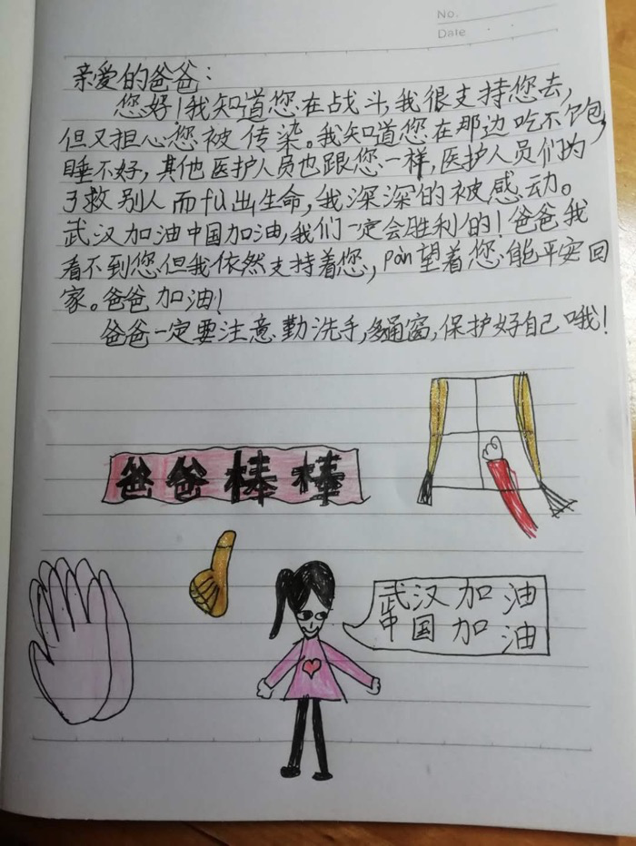 看到这封信,爸爸想对你说,爸爸很感动,女儿长大了,知道疼爸爸了。爸爸在武汉一切都好,这边有很多叔叔阿姨跟爸爸一起战斗,一起救治病人,一起抗击病魔,爸爸不孤单。今天我的几个病人情况越来越好了,这是我今天最开心的事情,虽然他们的亲人有的因为这个病去世了,但他们活了下来,给更多的人带来了希望。我相信,“疫情”只是暂时的,春天终将到来,加油武汉,加油中国!