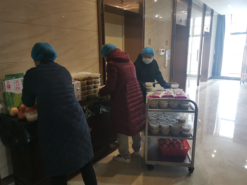但很快就发现这份幸福有些“酸楚”,没特殊情况大家都不准出房门,只要出房间门就要带着口罩帽子;进房门需要换三次鞋子,房间里不允许开空调;楼道里遇到同事,自觉隔开一米以上的距离,用眼神打招呼;电梯门打开,里面超过3个人,就会自觉等待下一趟。除了上班人员可以出酒店,每个人都被“禁足”了。开始时一日三餐还可以下楼到酒店大厅去拿,这短短几十米的路程成了最快乐的时光,每次我都是蹦着下楼。可是从本周一起,后勤保障部的老师直接把每日餐食送到了各个楼层的电梯口,大家纷纷感叹,这饭来张口,衣来伸手的日子也不是那么好过啊。是的,所有这一切“软禁”措施都是为了进一步减少人员流动和互相接触,尽最大可能切断病毒传播可能,保护我们医疗队的安全,同时拯救更多的患者。