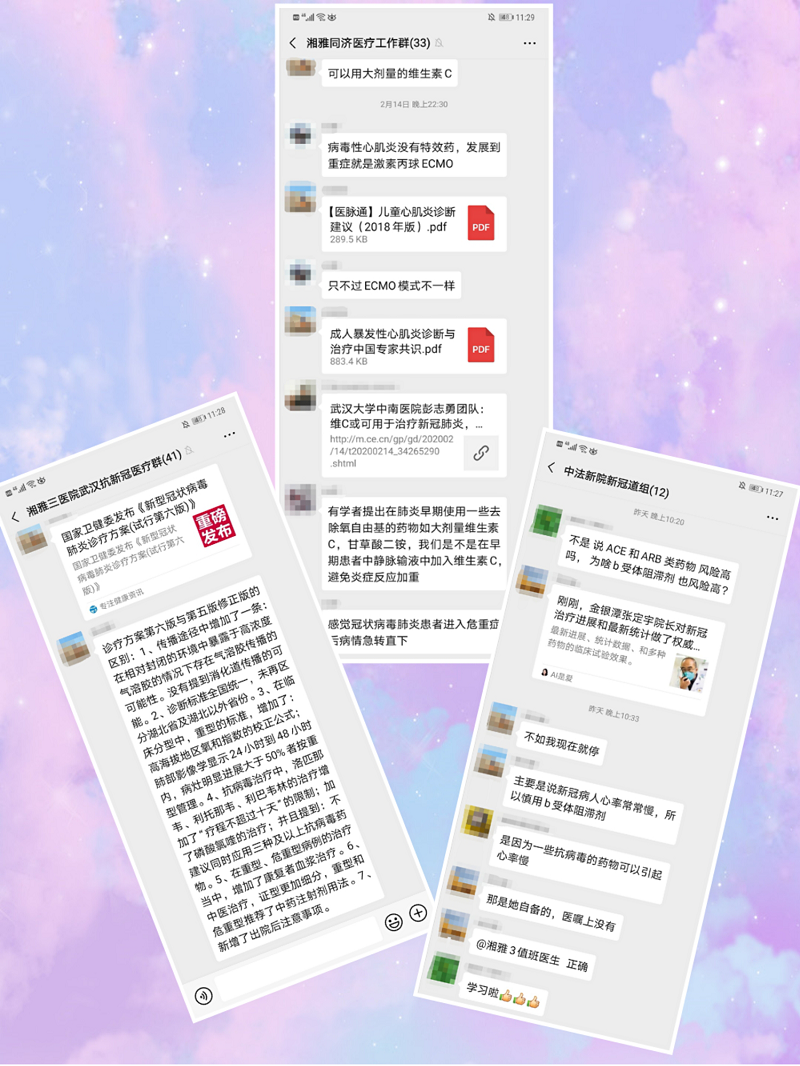 在“禁足”的日子里,微信群成为大家最主要的沟通场所,互相加油打气,通知,排班、吃饭,各种“专家共识、“治疗指南”和“最新进展”推陈出新,学习气氛浓厚!