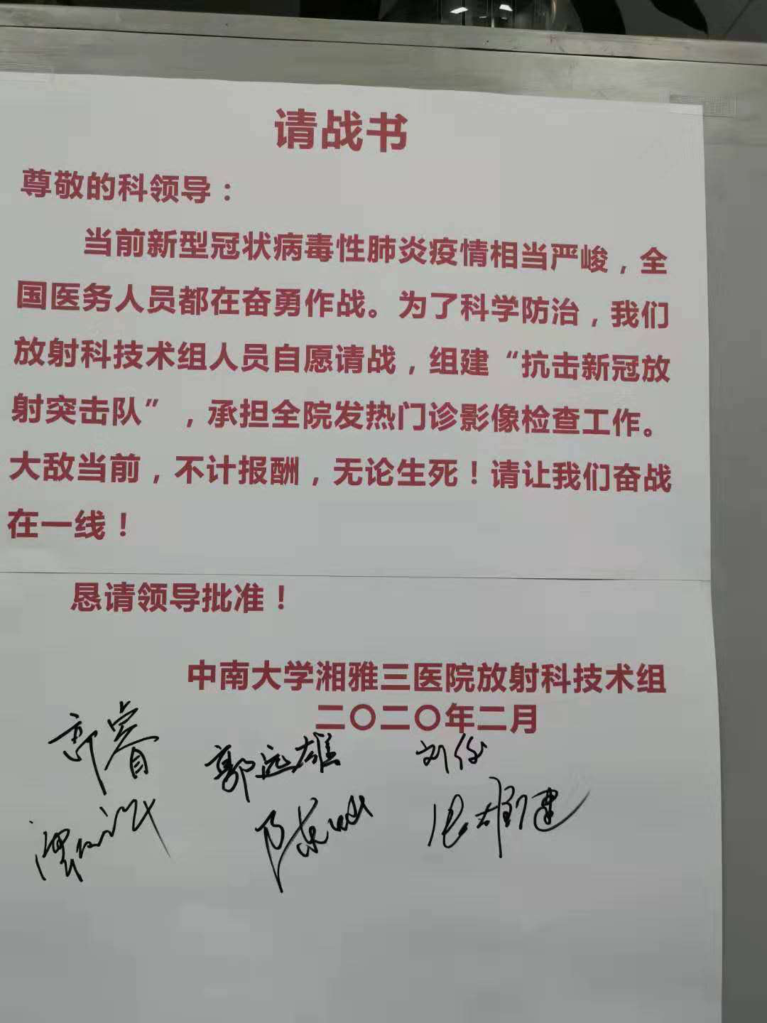 1月28日放射科党支部向全体党员和共青团员发出倡议书:新型冠状病毒感染肺炎是全民关注的焦点疫情。面对严峻疫情,医护工作者理应挺身而出,义无反顾。在这场不能输的硬仗面前,三院人一定有新湘雅的使命和担当,党员干部及共青团员更要发挥先锋模范作用。我们要守初心担使命,弘扬“敬佑生命、救死扶伤、甘于奉献、大爱无疆”的崇高精神。请共产党员和共青团员积极报名,展现新湘雅人的担当和使命,坚决打赢这场防治新型冠状病毒肺炎攻坚战。当由支部书记亲自撰写的征集抗击疫情的志愿者“倡议书”一经发出,短短几个小时内报名人数就多达110人。科室成立了“抗击新冠放射突击队”。郭睿主管技师、谭伏评主管技师、郭远雄主管技师、陈灿主管技师、刘俊技师、张雄健技师6位身体素质好、业务能力过硬的勇士光荣地加入战队。他们在请战书上宣誓:大敌当前,不计报酬、无论生死、英勇奋斗、不负使命!