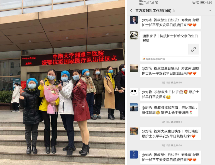 党员、护士长刘艳同志做为放射科护理代表入选第一批援鄂国家队,她说:作为一名党员,在国家遇到困难的时候,必须体现党员的担当、担负起党员的责任,援鄂抗疫责无旁贷。放射科党支部也全体动员为她做好物质准备。支部每周开会讨论抗疫员工心理和生活困难,支部和工会定期联系员工以及赴鄂抗疫的刘艳护士长。目前,刘艳已经在武汉前线奋战十多天了。这期间,恰逢刘护士长父亲七十大寿。哪位老人不心疼自己的子女,古稀之年,谁不希望子女能在这重要的时刻陪在身边?而此刻,他的女儿,却在最危险的战场(同济医院重症监护室),穿着里三层外三层的防护服,以最温柔却最勇敢的形象冒着生命危险冲锋陷阵。