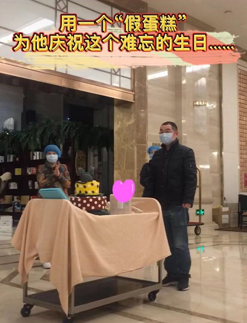 其实来到武汉的第二天,万齐全就开始思索了,2月10日就是你的生日。其它队员都不知道,而他也没想和别人说。天气很冷,诺大的驻地只有133人入住,空荡荡,不能串门,不能倾诉,甚至不能一个人走路。没有生日蛋糕,武汉的饭菜终不如家里味道。于是,随着你的生日的来临,万齐全只能在房间里独自踱步,听着时间滴答滴答的流逝。然而,万齐全想错了,就在这个清冷的酒店里,物资还不齐全,流程还在探索,甚至彼此还不认识的时候,医疗队却有人开始为万齐全悄悄准备生日惊喜,没有生日蛋糕,就用模型代替,没有家人陪伴,战友就是你的家人。于是假蛋糕代替不了真感情,一场温馨的生日祝福在这里上演。