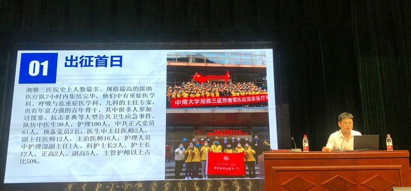中南大学湘雅三医院儿科副主任,援鄂国家医疗队第二支部书记陈志衡以“基层党组织的担当和责任”为题,从一位医生的视角分享了党员在疫情中冲锋向前,吃苦在前的精神,陈志衡说到:“在出发之初,面对未知的病毒与恐惧,家人朋友纷纷出言劝阻,而作为基层支部书记的信念是‘我是党员,我是支部书记,我一定要上。”