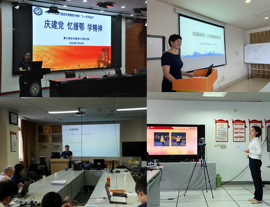 各临床医技科室党支部纷纷邀请本支部、本总支援鄂抗疫队员们分享在新冠肺炎抗“疫”前线抗疫经历。陈志衡、苏红辉、黎娅、周顺盈、杨沁婧、李守根、尹欣林、钟竹青等一大批援鄂抗疫同志真诚地讲述了他们在一线奋战的动人故事、艰难时刻与感人瞬间,同志们用一张张“最美”照片、一个个感人故事、一句句肺腑感悟,向支部的党员同志们讲述了肩负着职责和使命的新湘雅人如何在疫情最前线实践保卫人民健康的铿锵誓言。