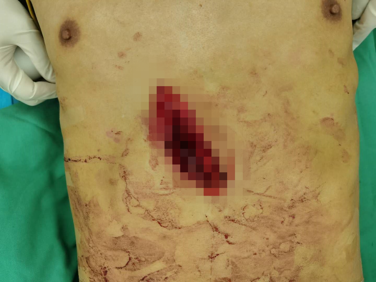 患者陈某,男,34岁,因“腹部刀砍伤半小时”入我院急诊,面色苍白,大汗淋漓,右肋缘下见15*5cm伤口,伤口贯穿腹壁,活动性渗血,可见部分肝脏及肠管暴露。初步诊断:创伤性休克,腹部开放性损伤。入院立即予以抗休克治疗,并积极完善相关检查及肝胆外科、胃肠外科会诊,同时启动急诊科创伤救治流程。