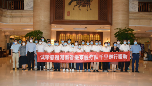 援京抗疫工作结束后,国家卫生健康委医管中心主任王健,北京市朝阳区卫健委党委书记李靓,北京市垂杨柳医院党委书记张新庆、院长陈方、副院长宋岩以及医院相关职能科室负责人一行到酒店为湖南援京医疗队送行,感谢湖南医疗队为北京市新冠疫情防控工作所作出的贡献。