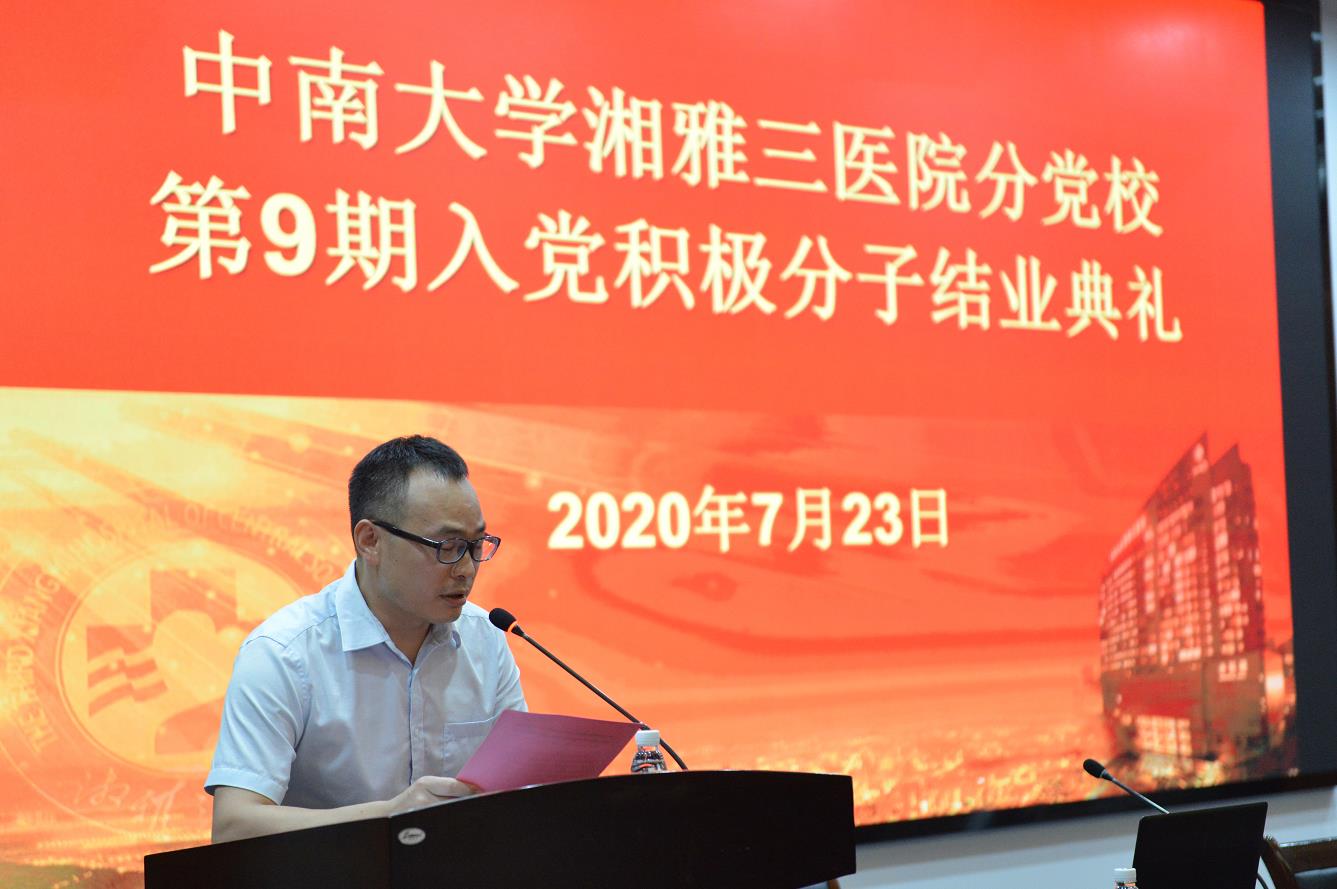 7月23日,医院分党校第九期入党积极分子结业典礼在外科楼二楼学术报告厅举行。医院党委书记、分党校校长何庆南,党委副书记、分党校副校长杨飞龙出席,各党总支书记、党办、党委宣传部、团委等相关职能部门负责人及全体学员参加,结业典礼由杨飞龙主持。