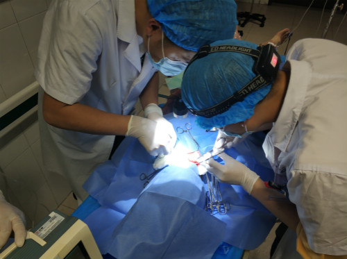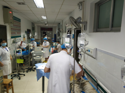 120急救车到达急诊,此时抢救室床位已满,主管护师郇晶晶、张树华、呼吸治疗师龙检等立即将三名患者安排在急诊走廊进行抢救,迅速建立两条静脉通路、急查血气、监测生命体征等。血气分析结果汇报患者均有严重的高乳酸血症,考虑到患者均为大面积烧伤(分别约为40%、50%、80%),合并不同程度的吸入性损伤。袁乐宏主治医师立即决定在B超引导下建立中心静脉通路,为后续液体复苏创造条件。外科二线班李亚勇副主任经过综合评估指示烧伤面积最小的于某吸入性损伤最为严重,需耳鼻喉科总住院立即行气管切开建立人工气道。与此同时,于某开始出现胸闷、气促等呼吸困难症状,在气切套管置入的瞬间,血性痰液和烧灼气味喷涌而出,患者的呼吸困难症状立即得到缓解。