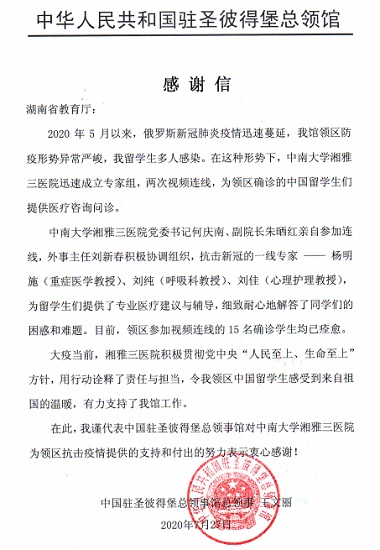 7月27日,中国驻俄罗斯圣彼得堡总领馆发来感谢信,感谢湘雅三医院对该馆领区抗疫工作的大力支持。