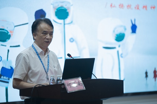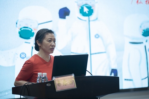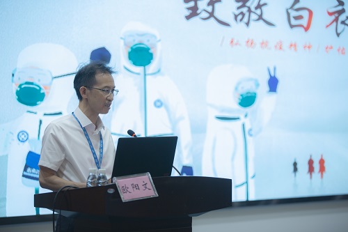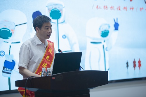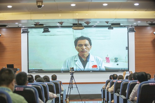 作为获表彰人员代表,援鄂医疗队临时党总支书记、援鄂医疗队队长王知非教授代表全体医师进行了发言,表达了对党和国家、对医院、对团队、对家庭、对自己的感谢之情。王知非以“三个度”高度概括了新湘雅人能在较短时间内高质量的完成了党和国家交付的光荣使命的原因:一是医院党委靠前指挥、行政周密部署,疫情防控阻击战有力度;二是专家亲临一线、医护精诚团结,湘雅援鄂有锐度;三是后方大力支持、领导亲切关怀,人文关爱新机制体现温度。援非医师代表赵孟文通过视频的形式与在场的人一起分享了在非洲工作的体验与感悟,并向全体医师同仁们送出了自己诚挚的祝福。