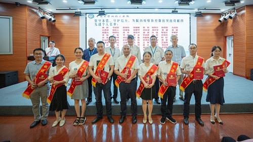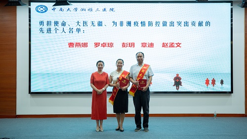 医院副院长欧阳文宣读了表彰决定,127名医师荣获表彰。在疫情期间,他们有的坚守本营、守护后方,为院内疫情防控尽职尽责,他们有的践行初心、全力以赴,为省内、北京、新疆等地的疫情防控不停奔波,他们有的勇担使命、大医无疆,为非洲的疫情防控贡献中国智慧,他们中还有的驰援湖北,逆行出征,为武汉疫情防控做出了突出贡献。陶立坚副书记、易露茜副主任、陈翔副校长、陈立章副校长、医院领导等为获奖人员进行了颁奖。