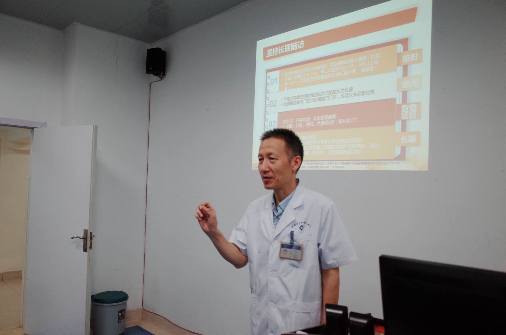会议中,蒋铁斌副教授用通俗易懂的语言,深入浅出地讲解了淋巴瘤的概念、病因、诊断、治疗及康复,重点强调了早期识别和坚持足疗程规范治疗对长期生存的重要性。阮春红护士长讲述了药物副作用的观察处理以及食疗、运动、心理康复、定期复查等知识。参会患者及家属专心聆听,主动记录,并在答疑中纷纷提出自己关心的话题,现场解除治疗过程中的困惑,病友们还在讨论环节中相互认识,交流了治疗及养病护理心得。此次患教会得到患友们的一致好评,取得了圆满的成功。