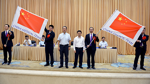随后,国家卫生健康委国际合作司副司长何炤华,湖南省卫生健康委主任、党组书记陈小春为两支医疗队授队旗,我院冯超副教授作为援塞医疗队队长接旗。何炤华代表国家卫生健康委肯定了湖南省援外医疗工作,并对湖南省下一步援外医疗工作提出了“提高政治站位、强化使命担当,深化中非合作、创新援外医疗,传播中国经验、讲好中国故事”三点期望与要求。