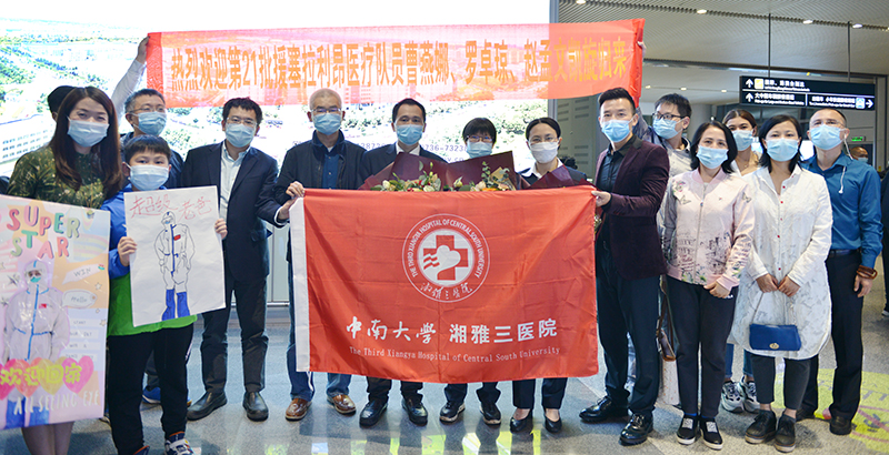 中南大学湘雅三医院党委委员、副院长朱晒红,相关科室负责人、职能部门负责人以及援非队员家属到黄花国际机场接机,并送上鲜花与问候。