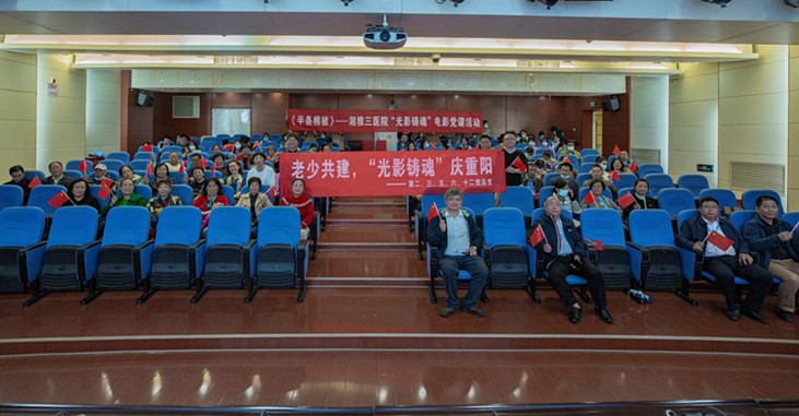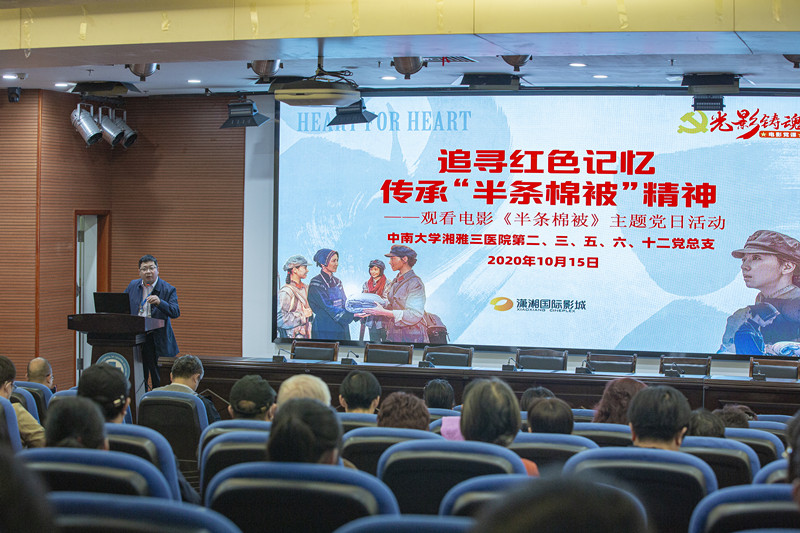 10月15日晚,中南大学湘雅三医院第二、三、五、六、十二党总支联合开展“光影铸魂”电影党课主题党日活动。医院党委副书记、工会主席杨飞龙致辞,党委副书记纪委书记张劲强和部分科主任、双带头人、护士长,离退休老党员等130余名党员干部共同观看电影《半条棉被》。